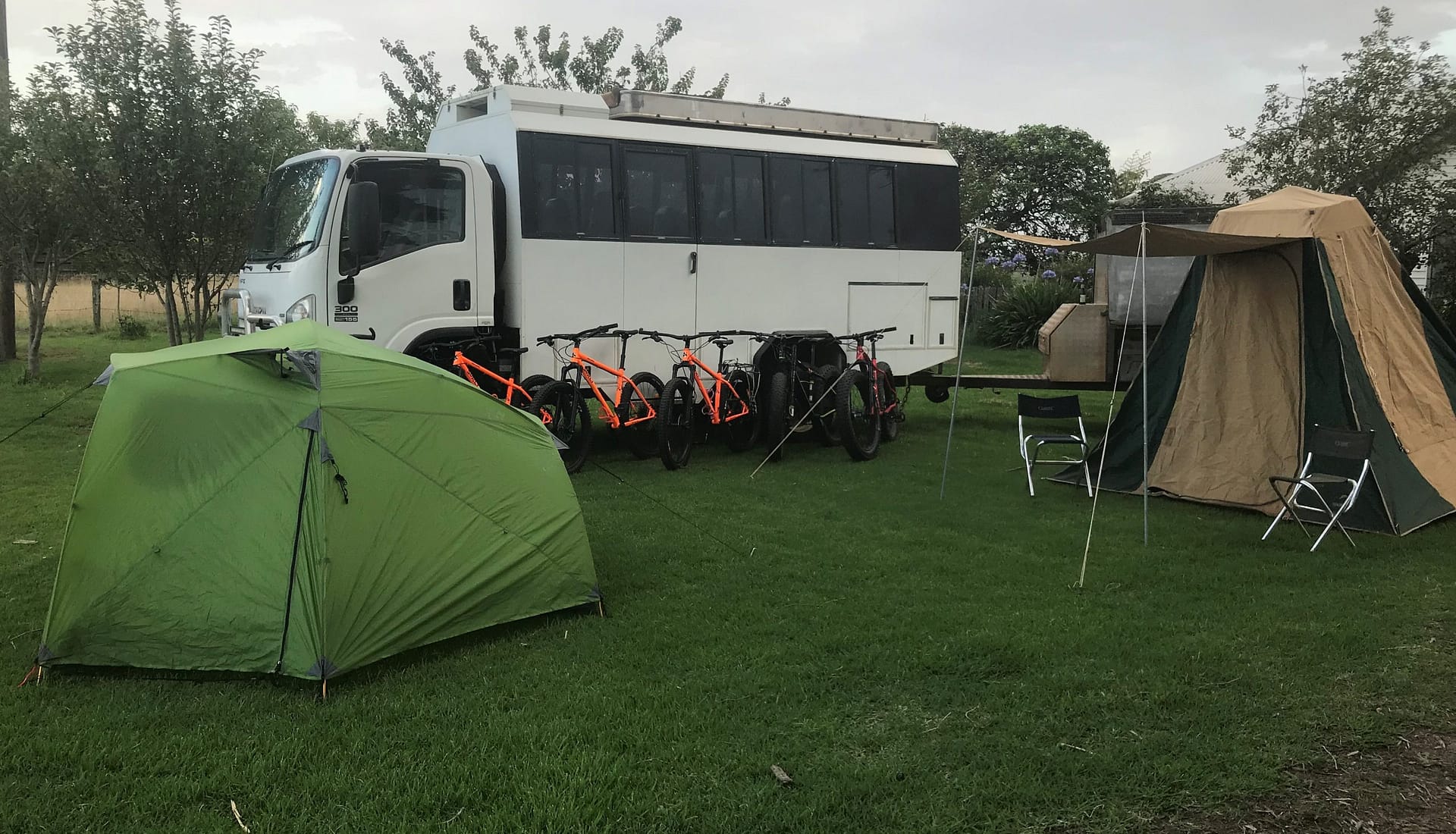 Our purpose built trailer is equipped with bike storage, a number of fridge/freezers and excellent camp kitchen.